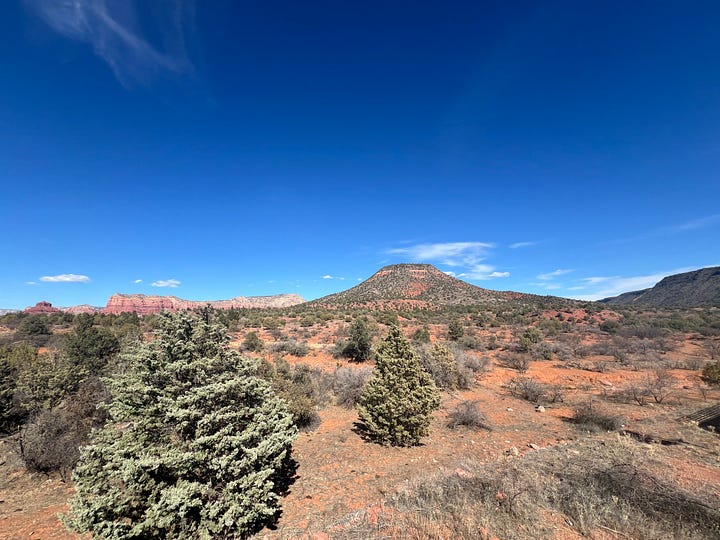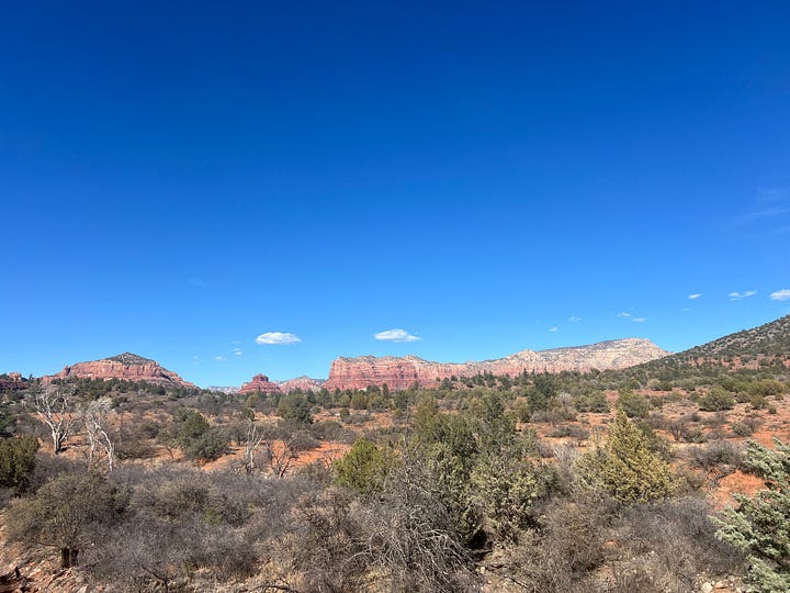 30 minutes into the 2-hour drive I briefly considered getting off Highway 17 and looking for a place to hike. Did I have the energy to do this drive? I pushed on because I wanted to see the beauty of the Sedona desert. I felt anxious driving 75 miles an hour on the narrow mountain terrain. I listened to my favorite music and did my best to take in the Earth’s natural blessings. As soon as I got out of the car, in front of the small town’s grocery store, I felt pain in my heart. This pain was close but not exactly the Costochondritis pain I am familiar with - this felt more raw. Then, I noticed I was personally out of gas. I bought a sandwich, chips, water, and a kombucha. I only had the energy to drink the kombucha. I tried to find the trail but lost connection and ended up at a private gated road. I turned around and sat at a table in a sunny parking lot on the main street. All I could do was do nothing.