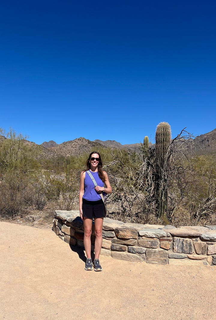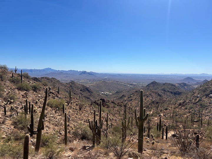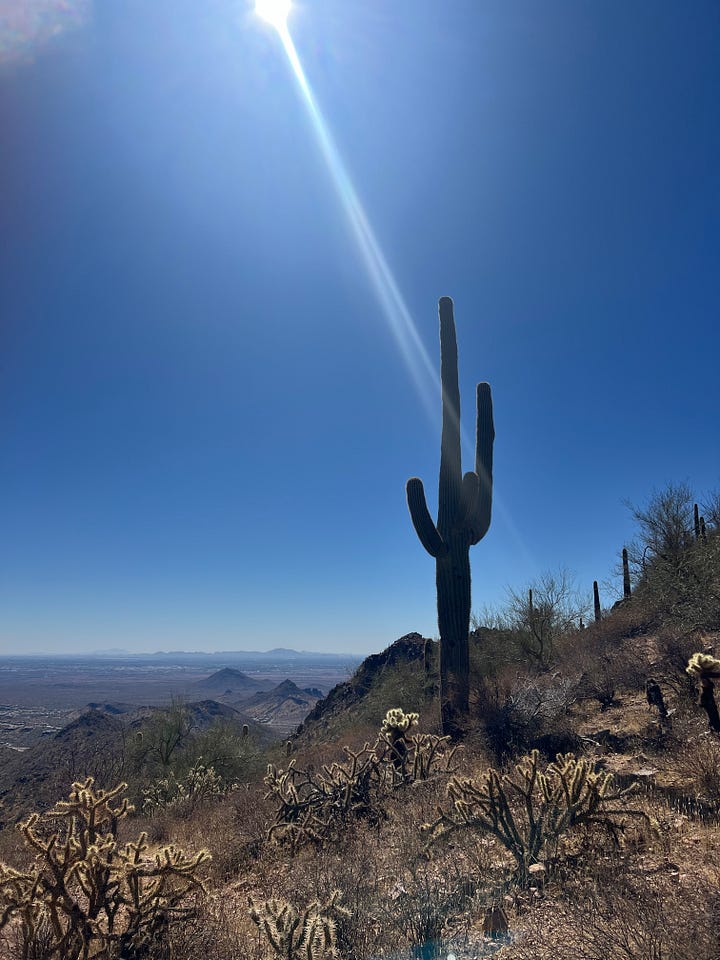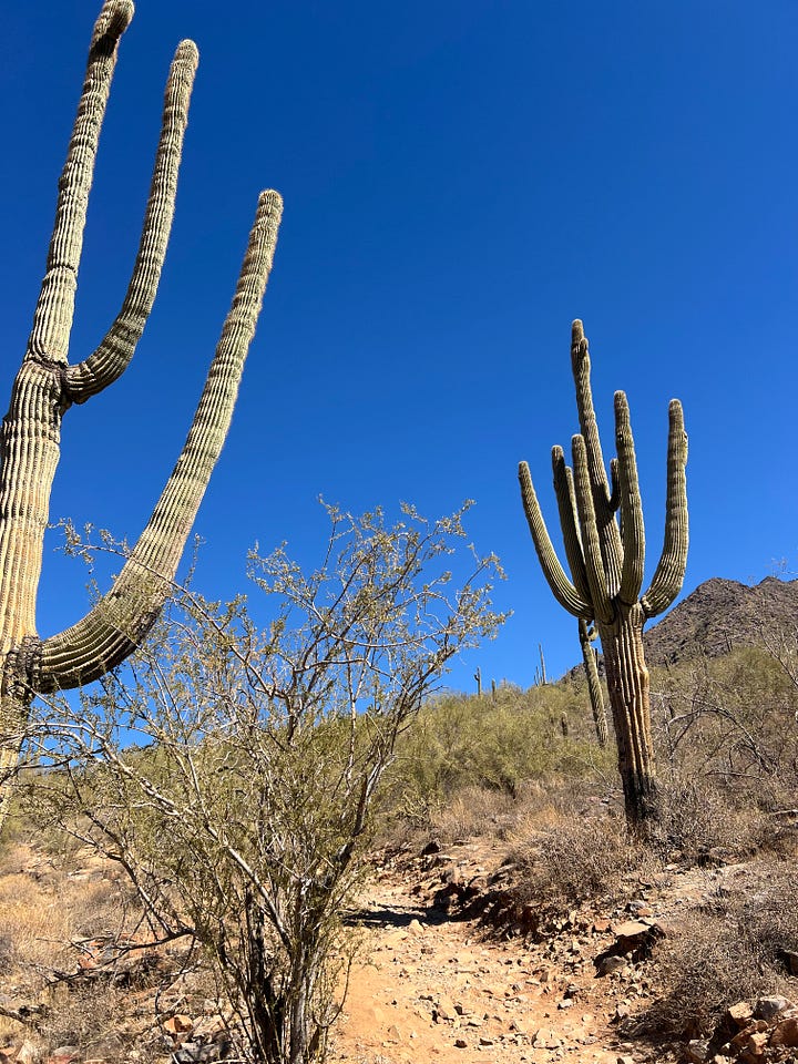 I headed north to hike again. McDowell Sonoran Preserve offers great hiking according to Tripadvisor. It is well-staffed. After listening to my goals, on a map, C highlighted two potential options and let me know at which points I’d need to make decisions. I met S, a local, on the Gateway Loop at WP1. He had stopped to rub his feet and was turning around. Reflecting on our conversation, I think S asked more questions than I did. He said the Saddle, the 676’ elevation peak, was a half mile forward. At the Saddle, I met a local couple and their guests, one also escaping the Midwest cold. The wife taught Journalism at U of I and assured me that my son P was in a great place at Parkland. This conversation began because of the man’s college tee. It felt wonderful to experience the 4.4-mile hike in the warmth.