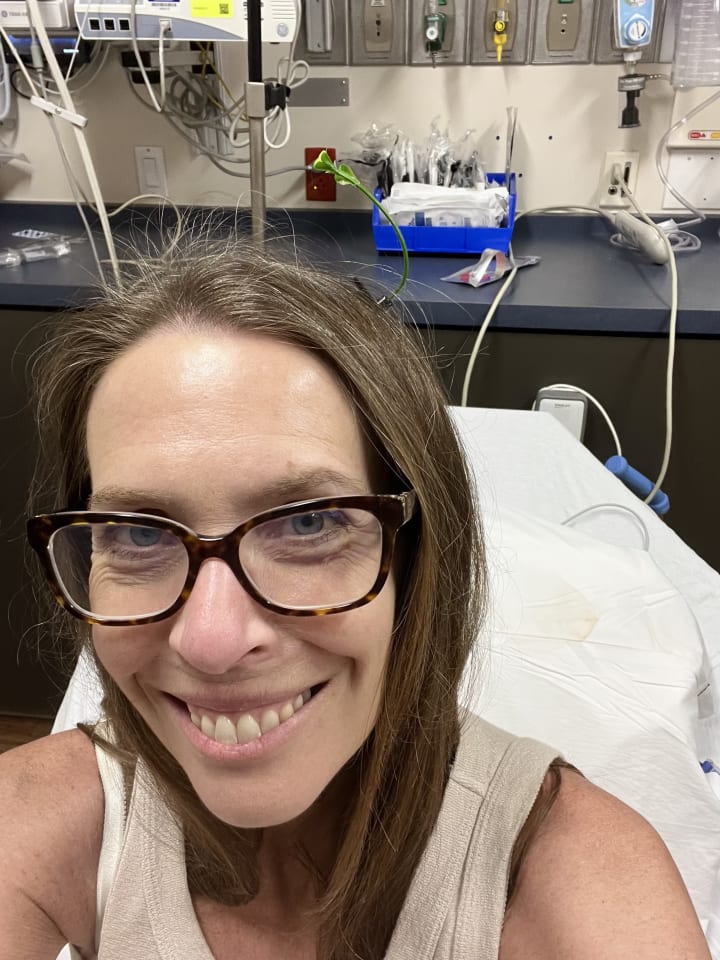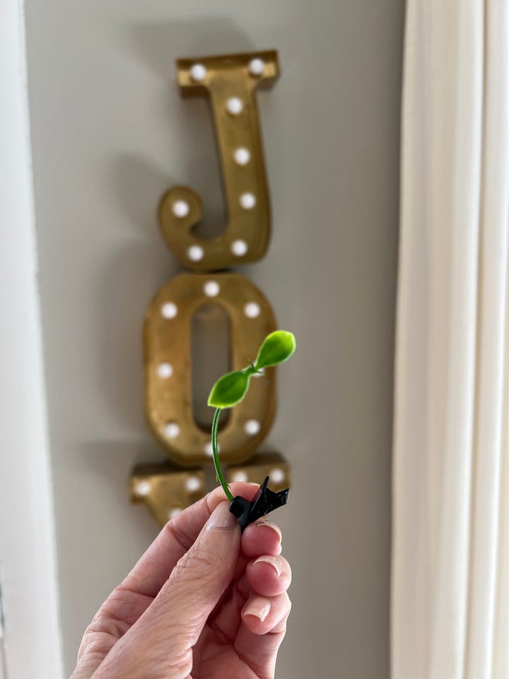 This was my third ER visit since living with Long COVID. I am now familiar with the process. EKG first, then bloodwork, and in this case an X-ray. On my last visit, it was a CAT scan. The ER doctor was nice and present. I learned things: my blood pressure level could be related to the consecutive lack of sleep, would not cause my level of pain, and walk two hours into my flight to avoid a blood clot. Labwork was normal, no evidence of a blood clot or pneumonia. The diagnosis was musculoskeletal chest pain. The first nurse failed to tell the doctor about my 1:45 p.m. flight. When I mentioned it right before the x-ray, my doctor gave me the option to skip it. When I said I wanted to proceed, he read the x-ray himself and sent in a cheery nurse to help expedite my exit. C had her hair in two braids and wore a pink hat with a sprout attached. She asked what I do, and then shared she owned a business in Hawaii. She got tired of working seven days a week and is now very happy working three days a week at the hospital. My blood pressure was down to 130/90 which she said was normal for someone about to sprint to the airport. She gave me a plastic sprout to pin in my hair. Joy arrived again. It shows up at the most unexpected times!